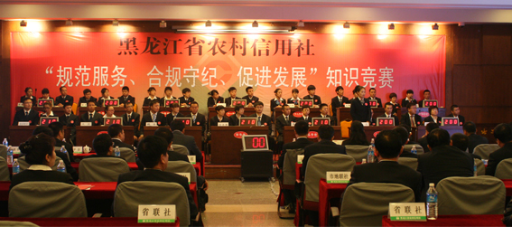 【省联社供稿】10月31日,“规范服务、合规守纪、促进发展”省级知识竞赛在哈尔滨友谊宫隆重举行。来自全省13个市地的14支代表队参加了比赛。省联社领导班子全体,各市地联社、办事处班子成员,各县级联社理事长观看了竞赛。