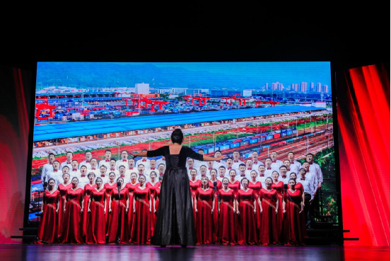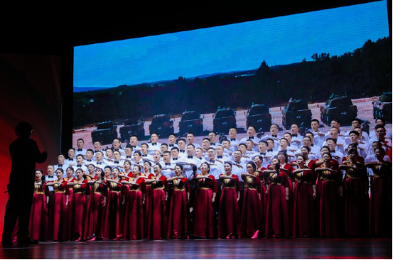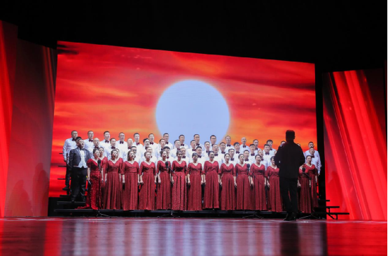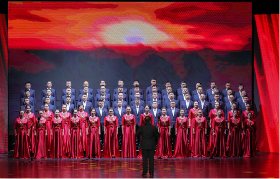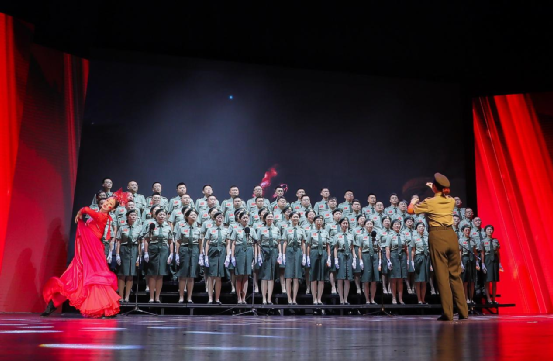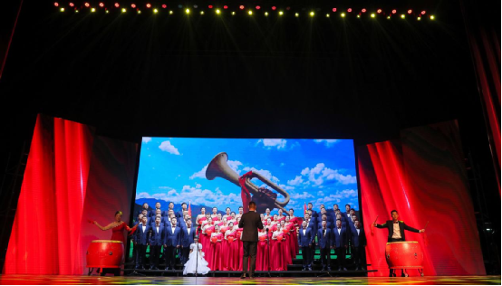 红歌嘹亮,唱响农商。文艺汇演在激昂的开场歌曲《我和我的祖国》中拉开序幕,全场共同合唱,用动情的歌声表达了对祖国的热爱之情。由哈尔滨联合农商银行总行机关及辖内12家县级行社组成的十三支合唱团,用歌声为祖国献上了诚挚的祝福,《灯火里的中国》《光荣与梦想》《不忘初心》《国家》《新征程》《我的祖国》等歌曲,唱出了人们对祖国的热爱和对党的忠诚。有身着红军军服的战士摇旗呐喊,有孩童清澈稚嫩的童声吟唱《万疆》,还有现场与抗日小战士通过跨时空对话而引出的合唱《祖国不会忘记》等等。